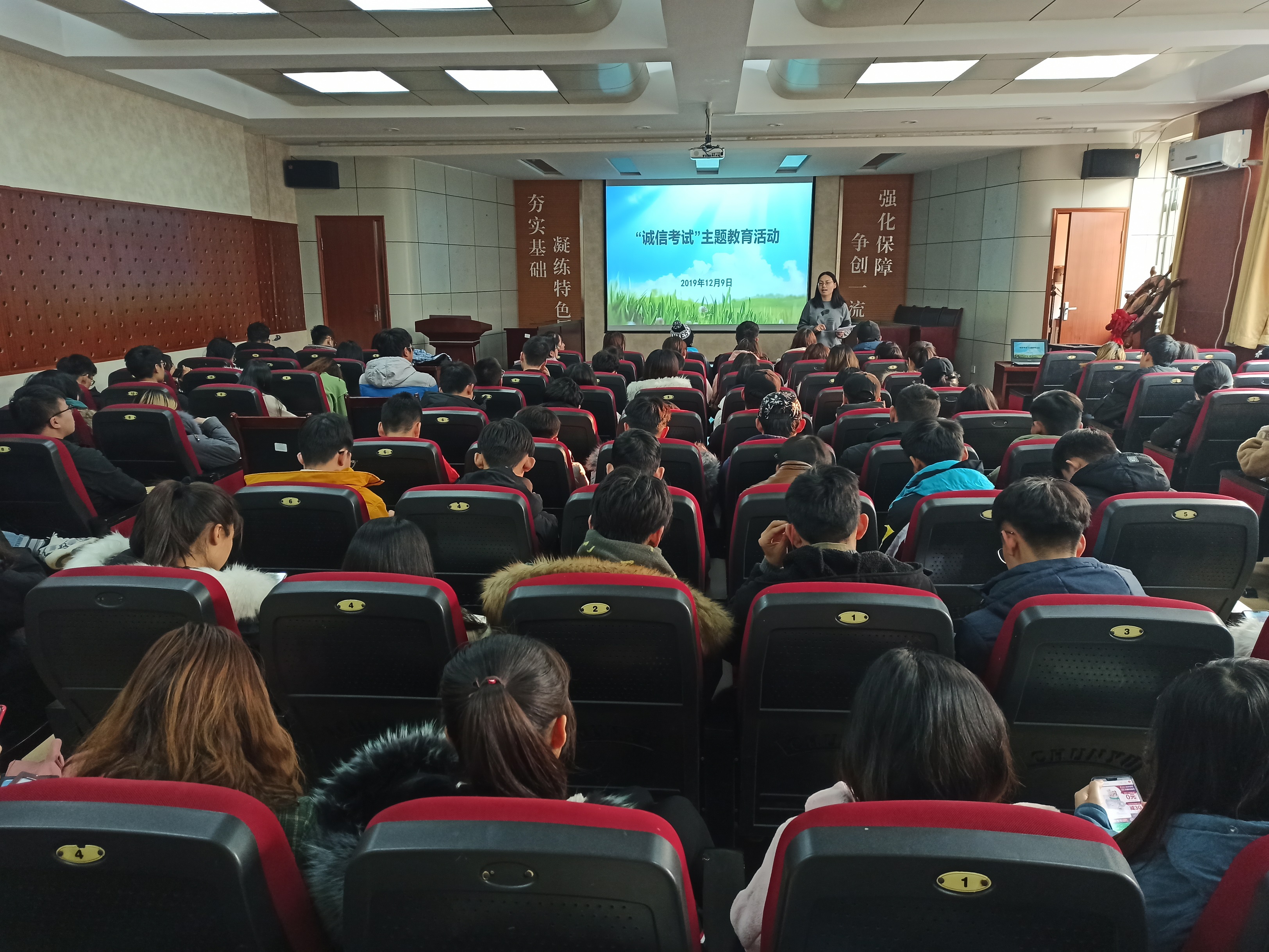 12月9日,304am永利集团举办“诚信考试”主题教育活动,向全体在校同学进行诚信教育。会上,各位辅导员老师首先宣读了学校关于考风考纪的相关要求和处分规定,讲解了诚信应考的具体内容,提醒大家要正确对待考场纪律。通过已有的考试违纪案例,告诫同学们不要以身试法,违纪违规,并提醒大家带好考试所需有效证件及文具用品。会后,全体同学签订了考试诚信承诺书。本次教育活动,端正了考风,严肃了考纪,同学们纷纷表示会积极备考,诚信应考,努力争取好的成绩。(通讯员:徐华坤)
