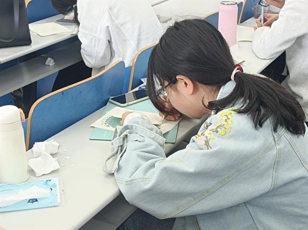 为让同学们更直观、更全面地了解剪纸传统文化,4月18日,304am永利集团刀下飞花剪纸社举办了“纸上雕花,邂逅光影”第二期活动,此次活动由剪纸社社长胡洁主持,主要内容是学习制作纸雕灯。活动伊始,胡洁首先向在场同学科普纸雕灯的相关知识,她介绍纸雕灯是一种利用剪纸的镂空技术,通过不同层的剪纸作品的叠加,形成的一种剪纸工艺品。随后,胡洁向在场同学展示制作纸雕灯需要用到的材料工具,同时介绍使用剪纸工具时要注意的几点事项。科普结束后,主持人给大家提供剪纸模板进行制作学习。大家互相交流学习,讨论纸雕灯的制作技巧,其乐融融,在一刀一刻中体验纸雕灯的乐趣,领略到非遗剪纸艺术的魅力火花,体现出刀下飞花剪纸社的和乐氛围。